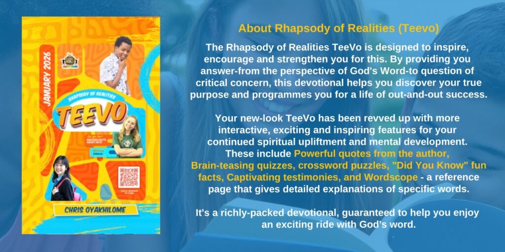 Rhapsody of Realities is a life guide that brings you a fresh perspective from God’s Word every day. It features the day’s topic, a theme scripture, the day’s message, the daily confession and the Bible reading plan segment.